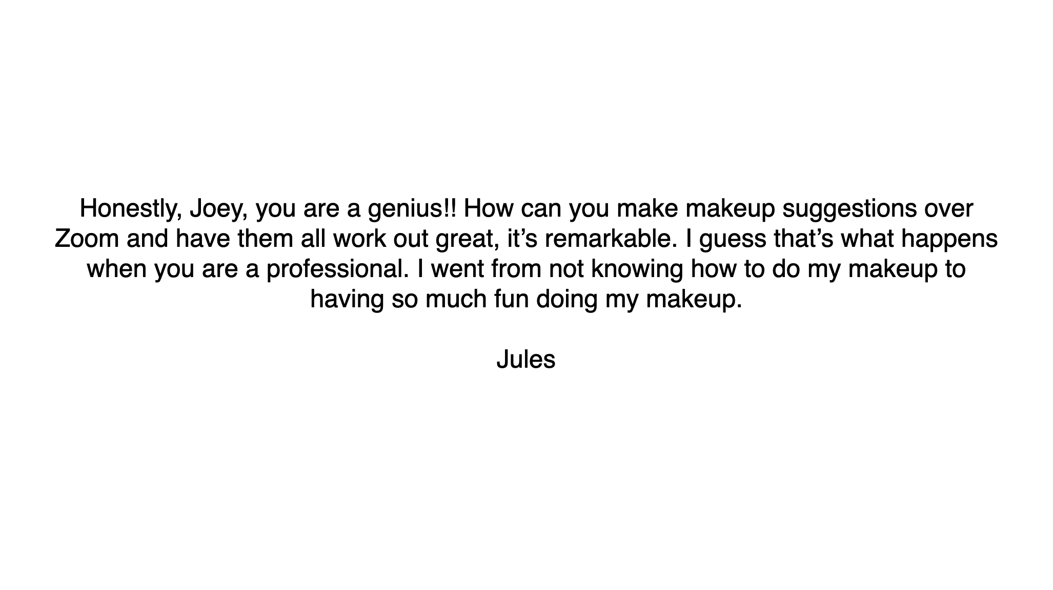 Joey provides virtual makeup sessions through Zoom helping you simplify and optimize your beauty routine. Using your existing products and following your process Joey will provide his expert guidance empowering you to achieve your day to night beauty goals. Additionally Joey offers recommendation and links to products that will elevate your desired look.